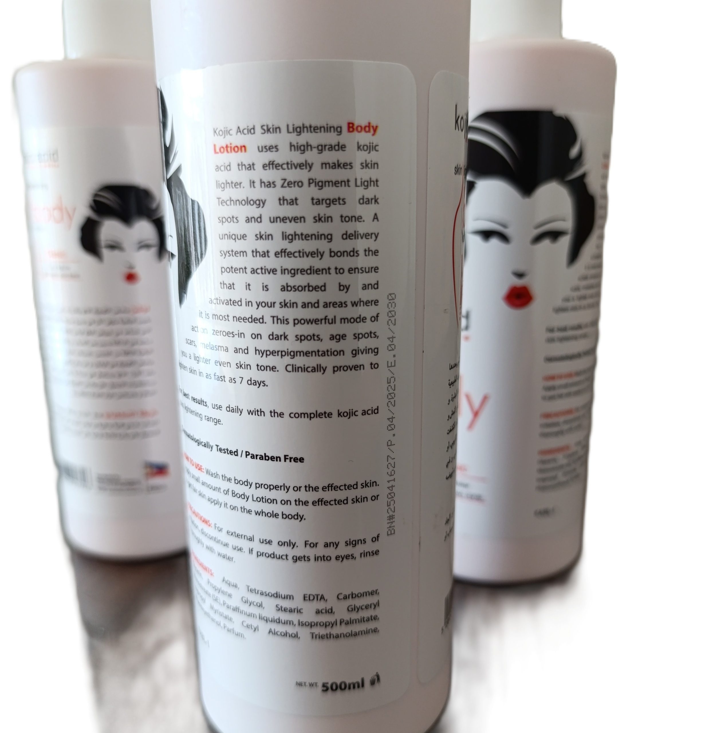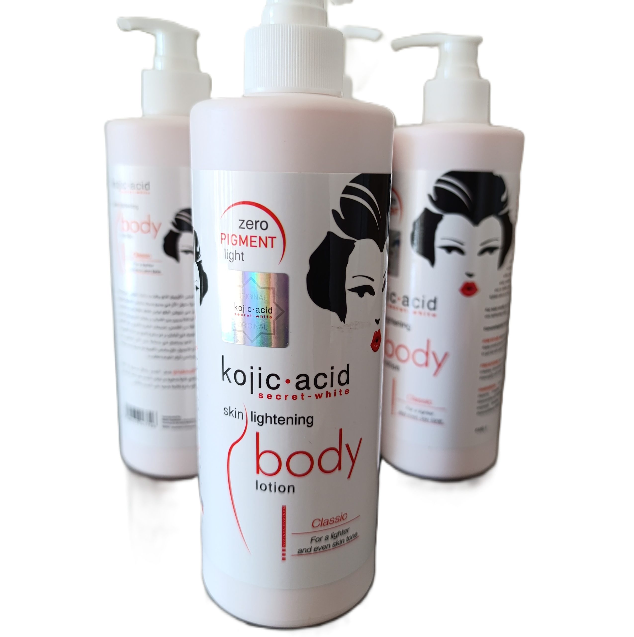 کوجیک اسید (Kojic Acid): ترکیب اصلی و موثر این لوسیون که بهطور مستقیم روی آنزیم تیروزیناز اثر میگذارد و مانع تولید ملانین (رنگدانه مسئول لکها و تیرگی پوست) میشود. نتیجه استفاده مداوم از این ترکیب، کاهش لکهای تیره، ملاسما و ککومک و ایجاد پوستی روشنتر و یکنواختتر است.
